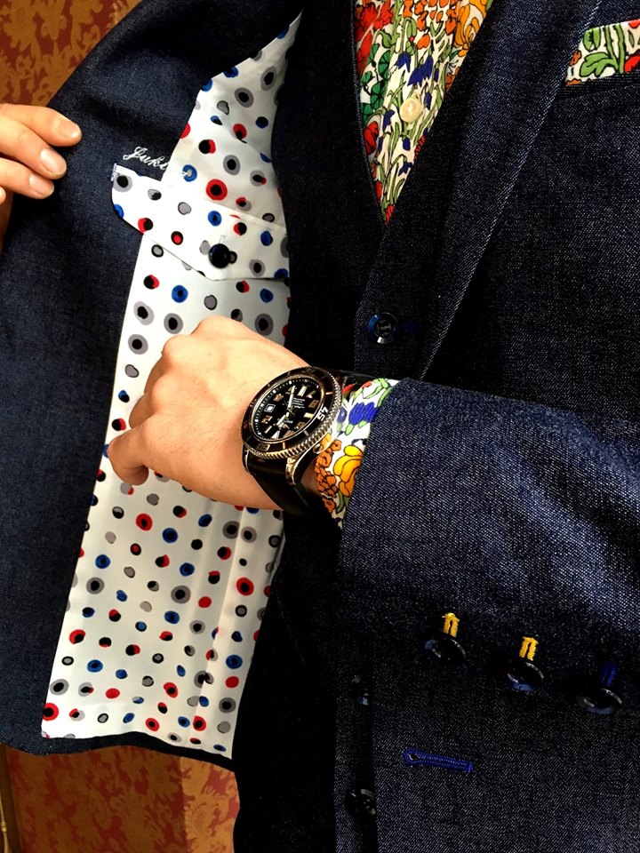 デニムの3ピース・柄シャツ・ポケットチーフ・蝶ネクタイ~シューズまで。