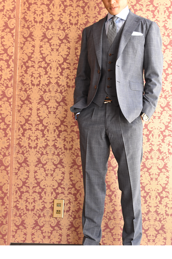 LOLO PIANA(ロロ・ピアーナ)MOOVING(ムービング)のスリーピース。 ストレッチがかなり効いているので、締めつけ感の無い着心地が相当快適です。 機能性だけでなく高級感も印象づけられます。 裏地無しのアンコン仕立てと、シアサッカーの凸凹した風合いで夏に爽やかな着こなしに。